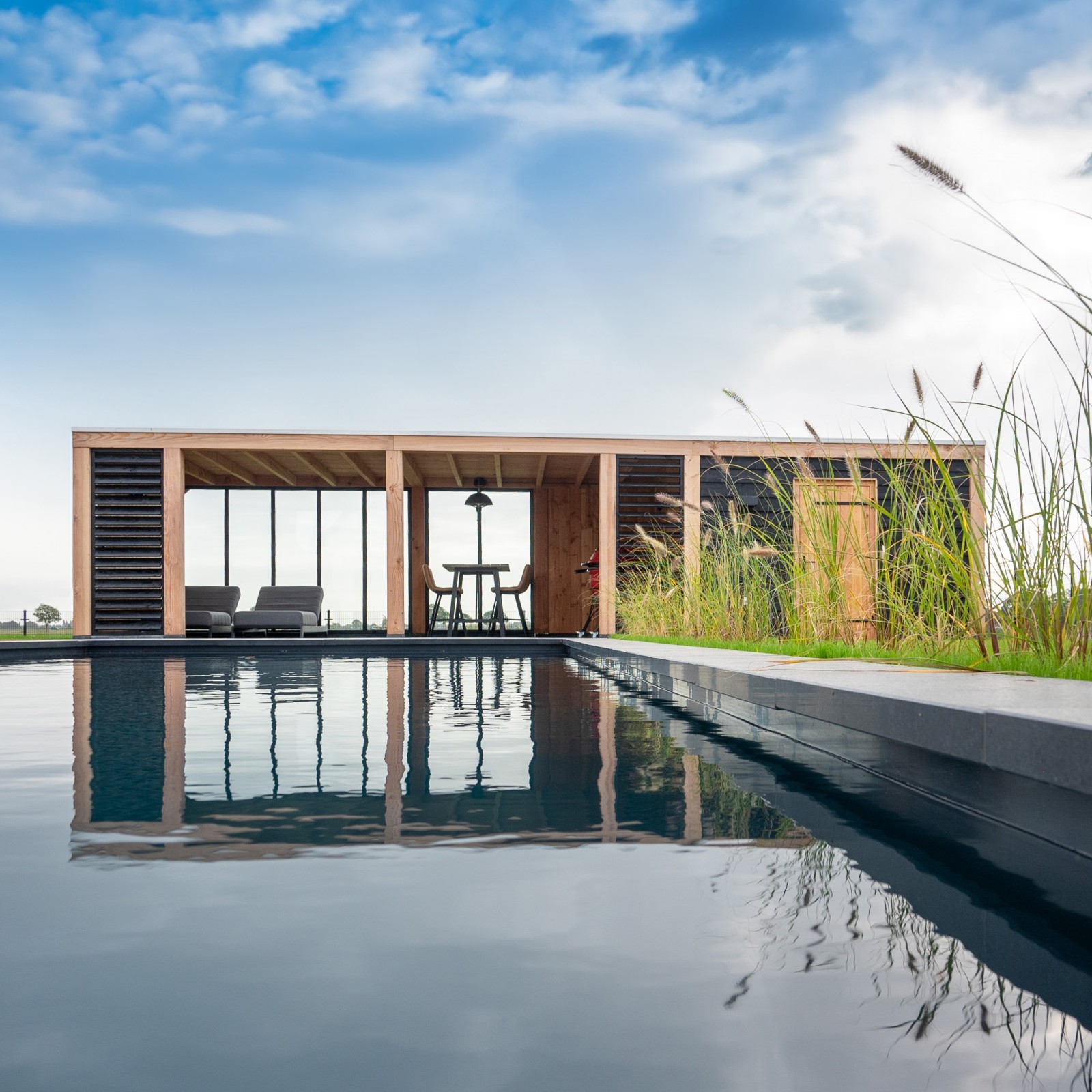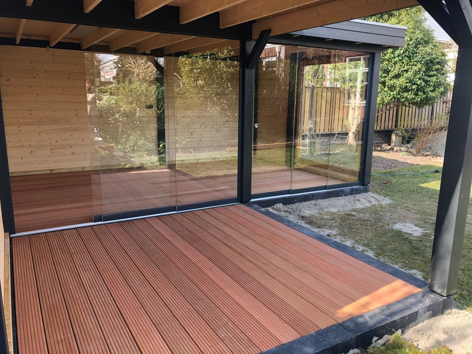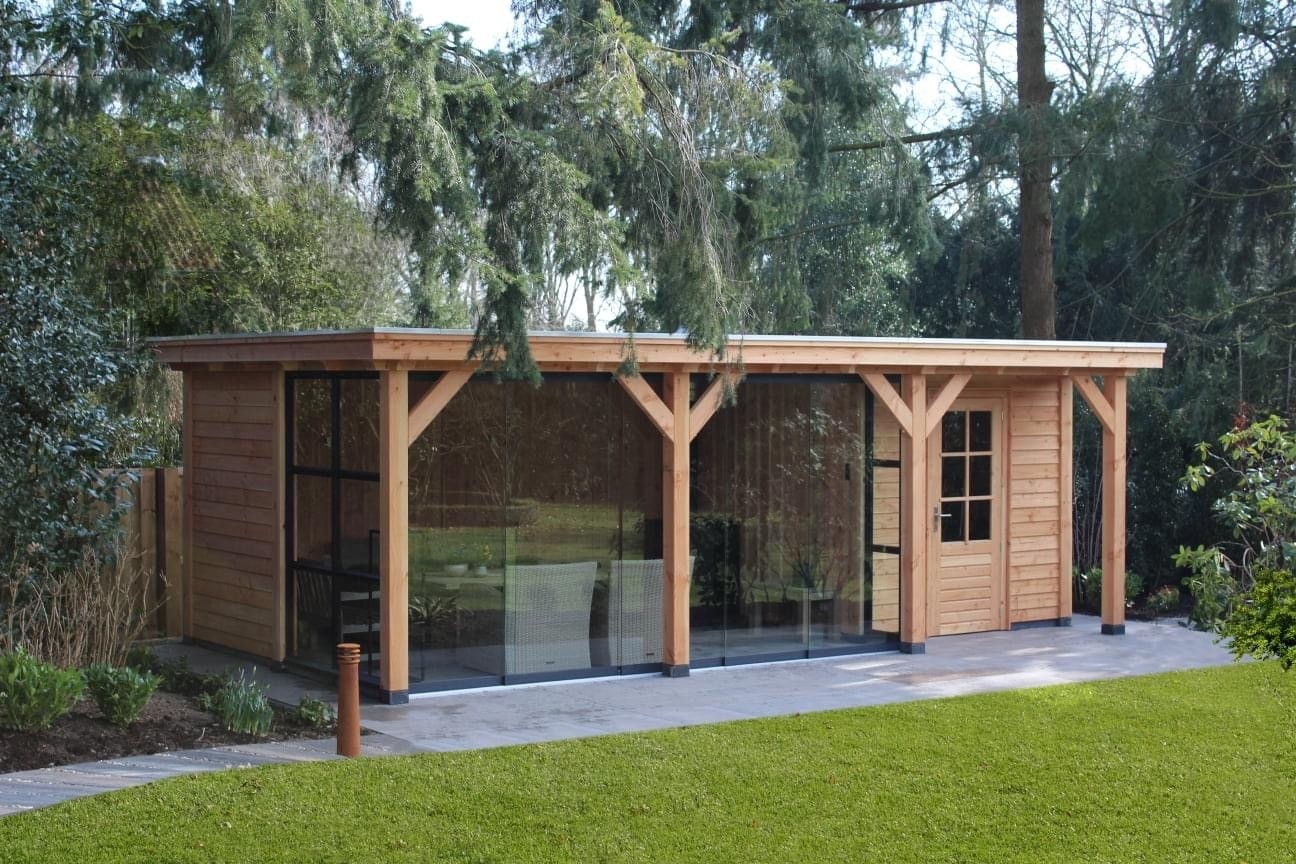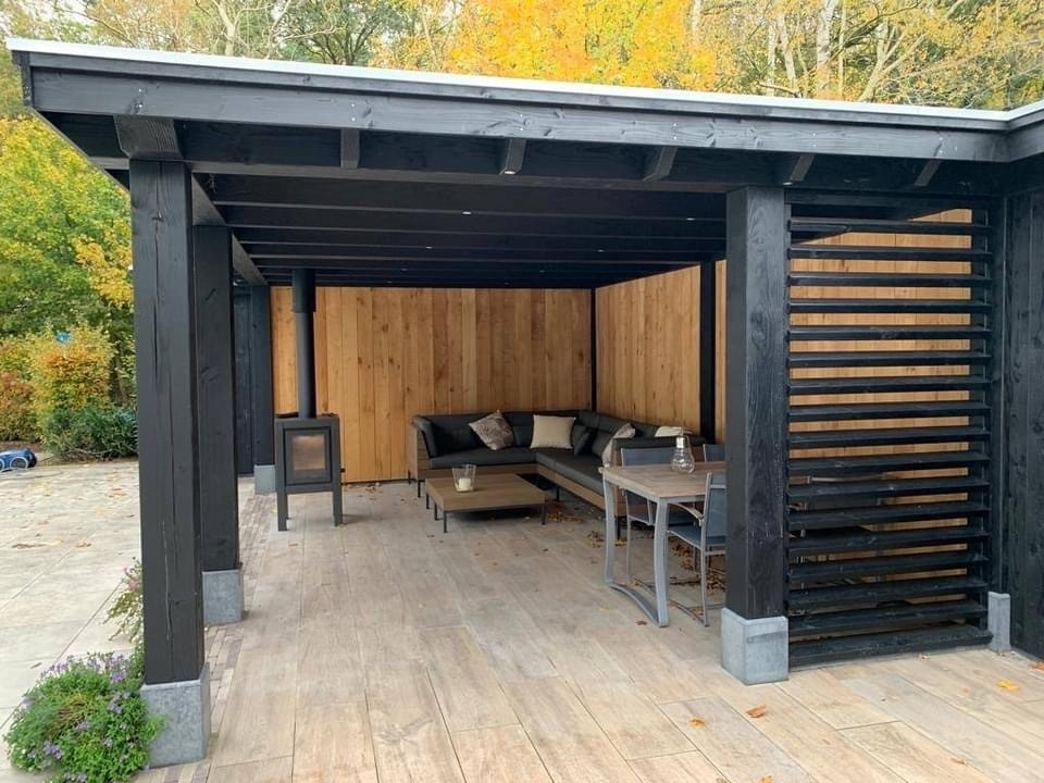 U kunt uw overkapping volledig naar wens samenstellen. Kies uit houtsoorten zoals Douglas hout, vurenhout, Siberisch lariks of eikenhout, en bepaal het daktype dat past bij uw stijl: plat dak, zadeldak, kapschuurdak of rieten kap. Voor de dakbedekking zijn er meerdere opties mogelijk, zoals dakpannen, dakpanplaten, felsplaten, glas of riet. Ook de wanden zijn naar wens samen te stellen, bijvoorbeeld met open wanden, glazen schuifwanden of vaste houten zijwanden, zodat uw overkapping precies aansluit bij uw leefstijl en tuinindeling.