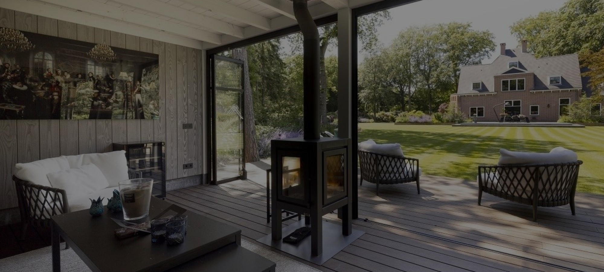 Douglas zadeldak voorzien van glazen schuifwanden. Luxe uitstraling door het fraaie pannendak gecombineerd met de zinken dakgoten. Het buitenverblijf bestaat uit drie componenten, een van de componenten is schuur/opberg ruimte geworden en de andere twee verblijfsruimte.