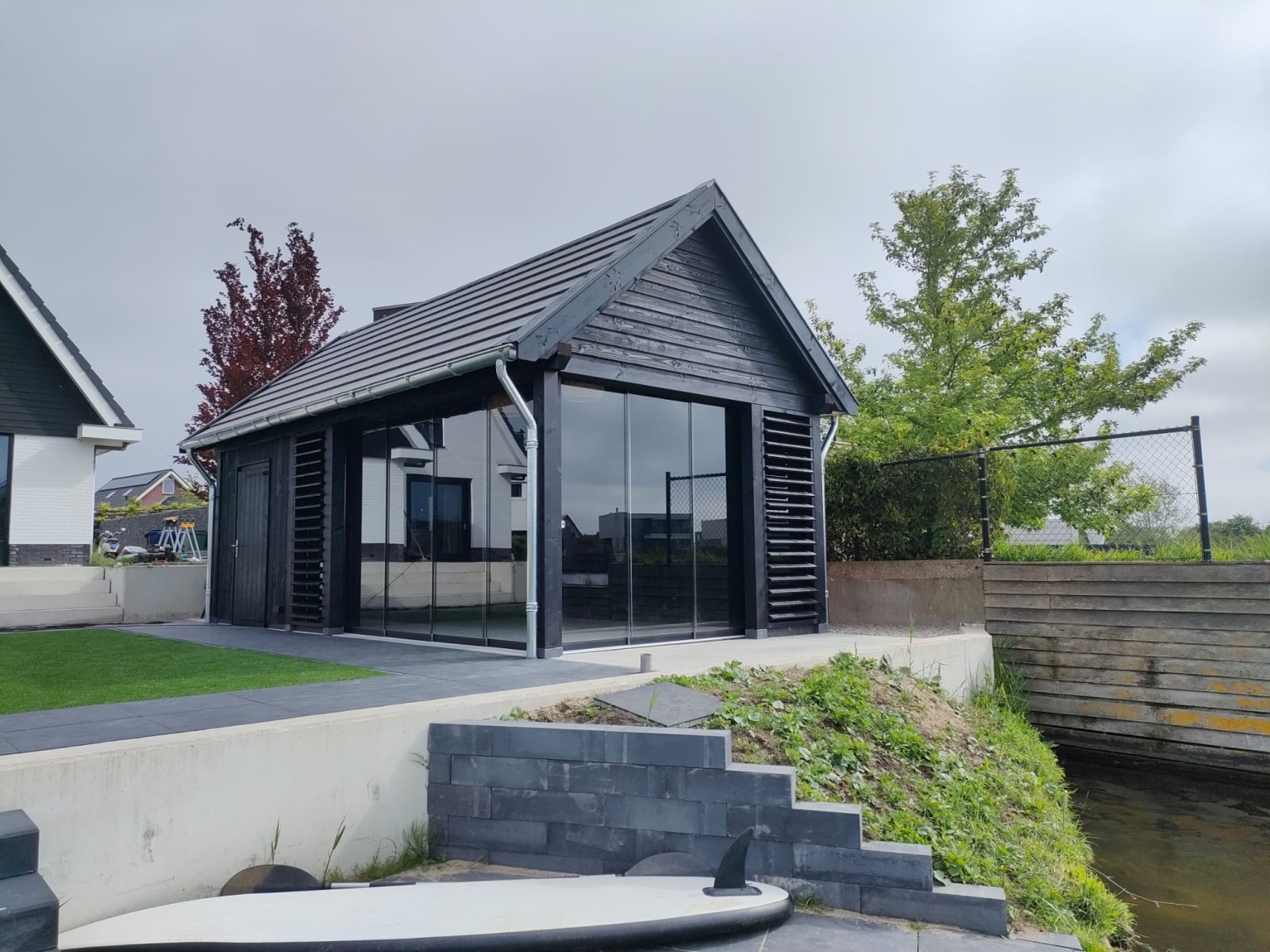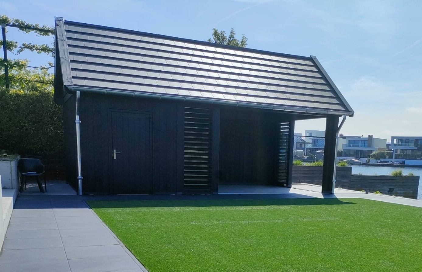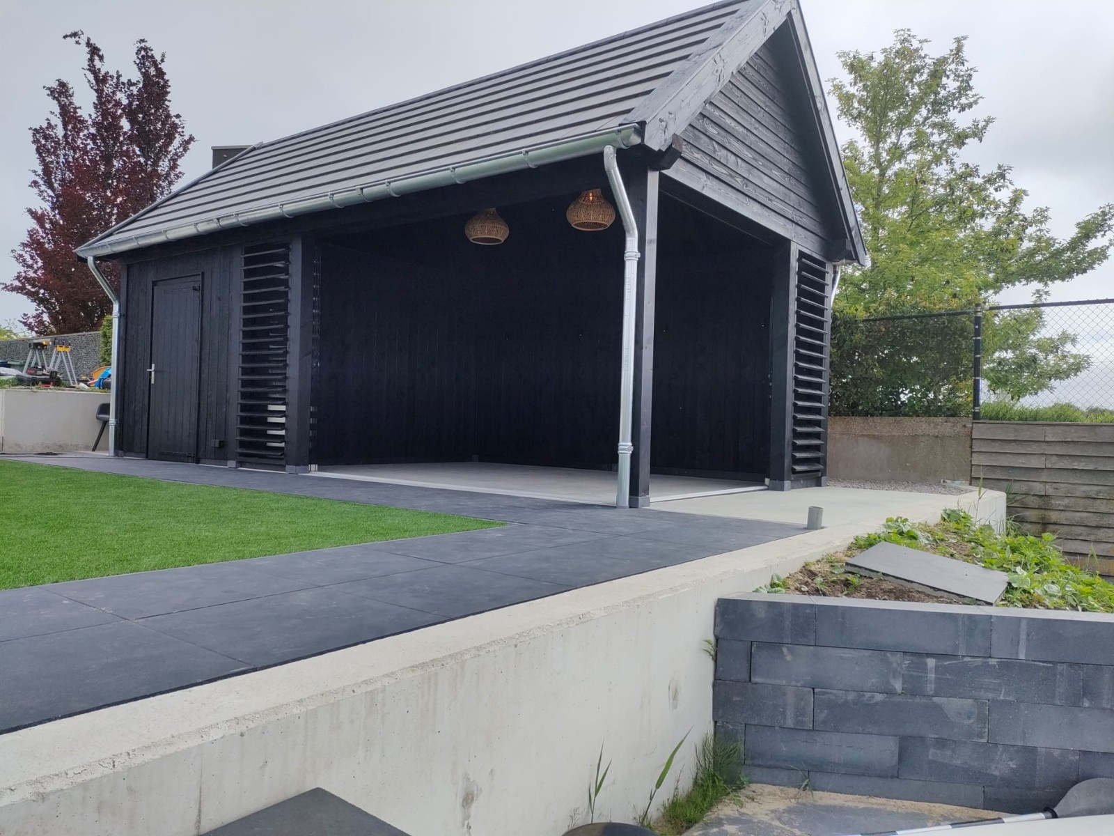 De hele constructie en wanden zijn zwart gebeitst wat hem een moderne uitstraling geeft. De strakke pannen en zinken dakgoten maken hem helemaal af. De glazen schuifwanden hebben wij achter de Louvre delen gemonteerd zodat deze hier achter staan bij het openen van het glas.