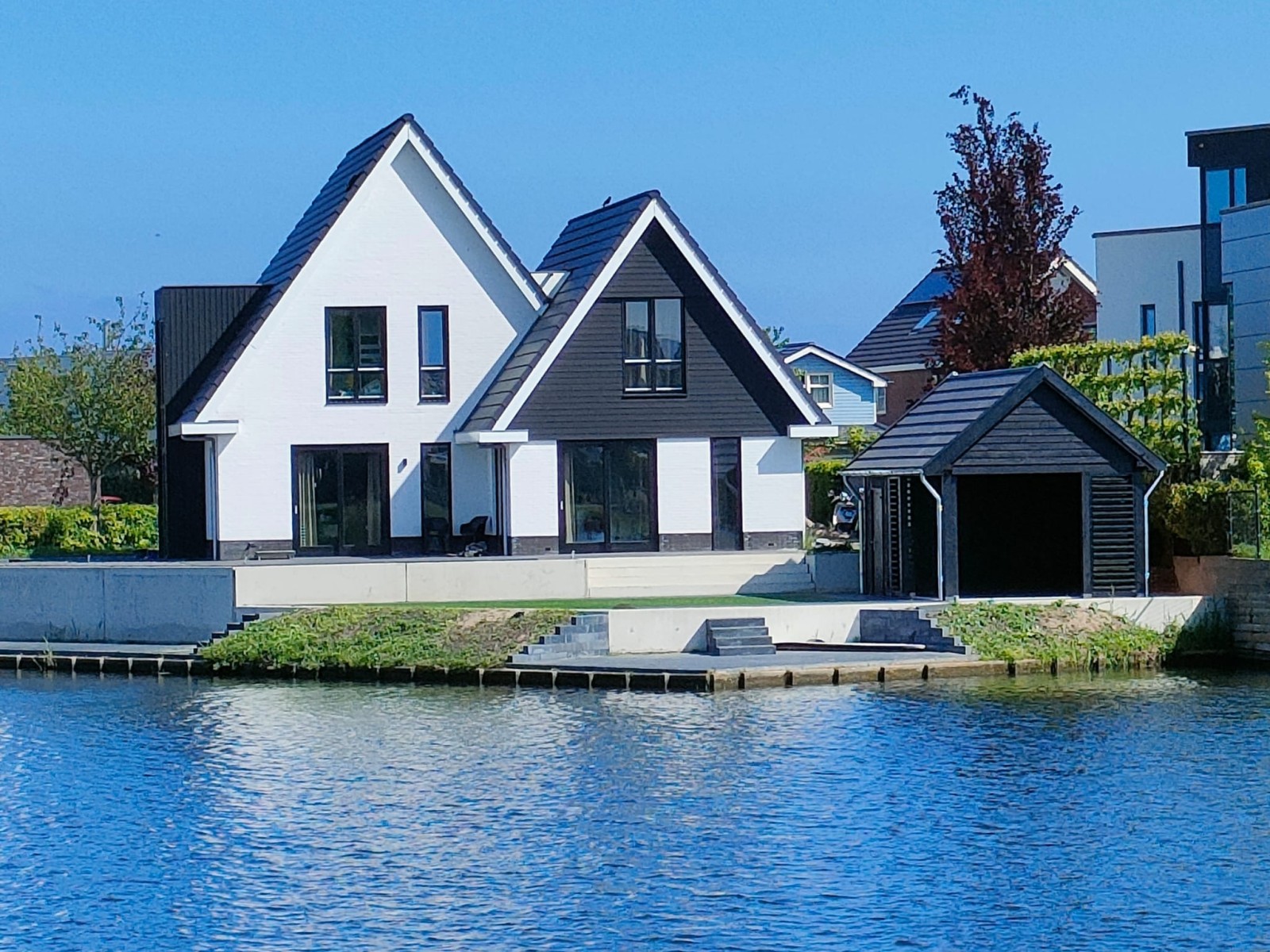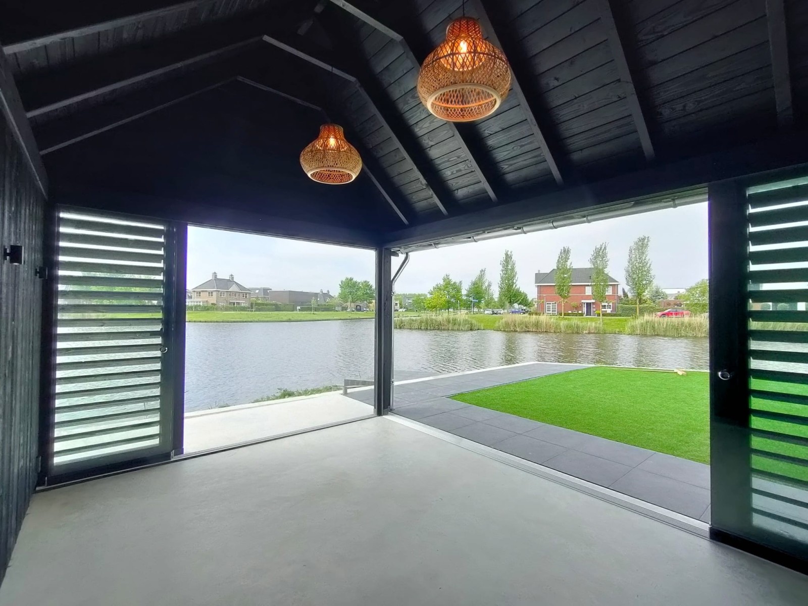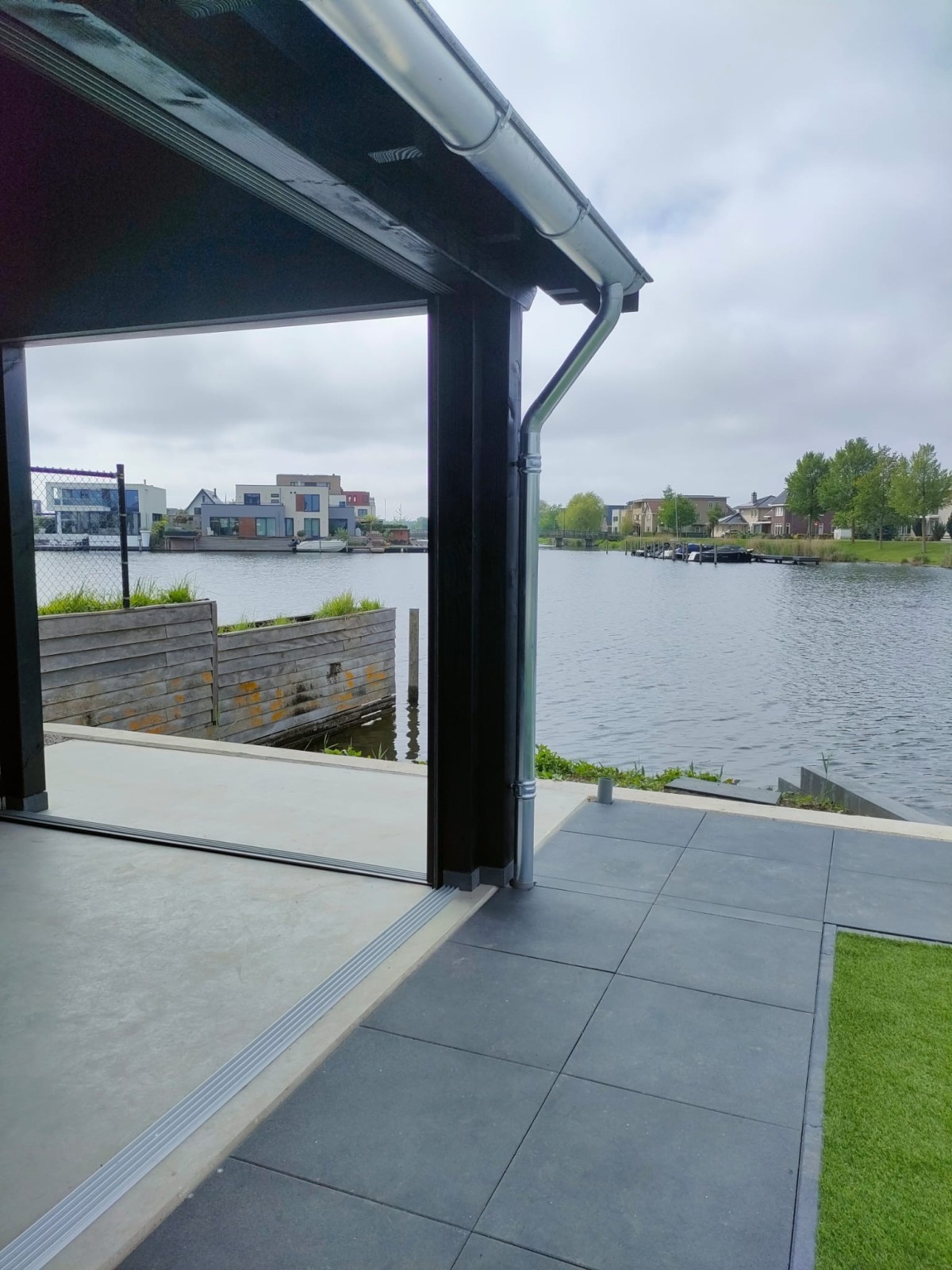 De hele constructie en wanden zijn zwart gebeitst wat hem een moderne uitstraling geeft. De strakke pannen en zinken dakgoten maken hem helemaal af. De glazen schuifwanden hebben wij achter de Louvre delen gemonteerd zodat deze hier achter staan bij het openen van het glas.