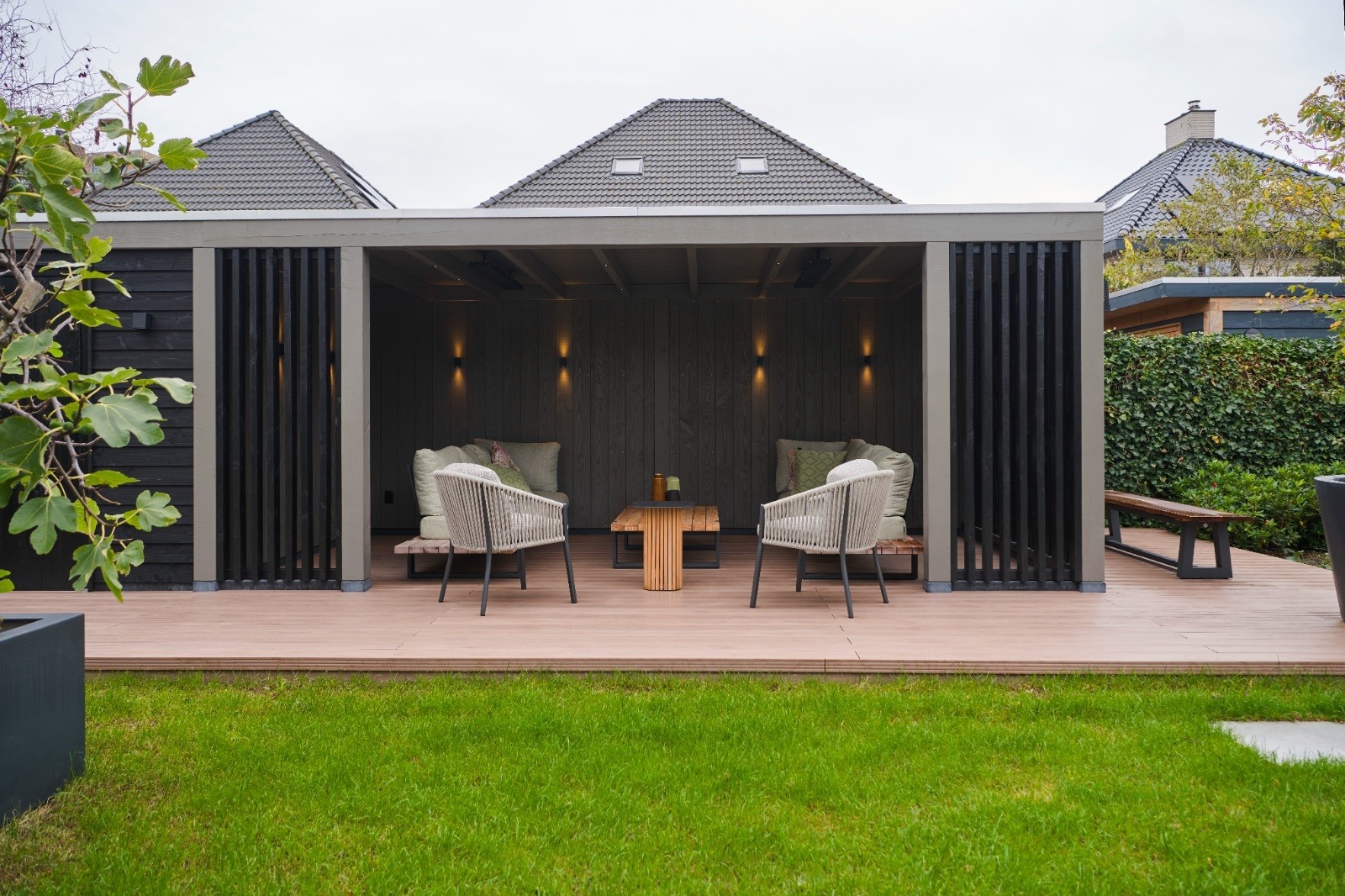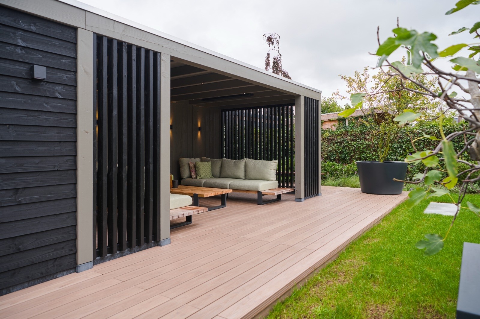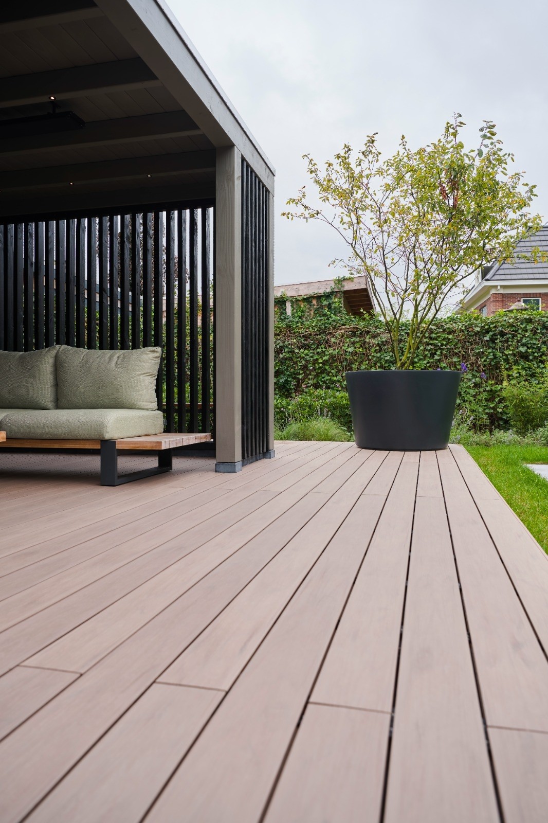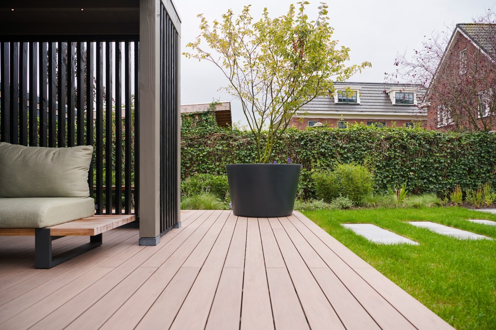 Bij deze klant hebben wij de hele tuin aangelegd. Het buitenverblijf is op een verhoging geplaatst door de kunststof vlonder middels een opstap te maken. De vlonder is geheel onderhoudsvrij en zal zijn mooie kleur behouden.