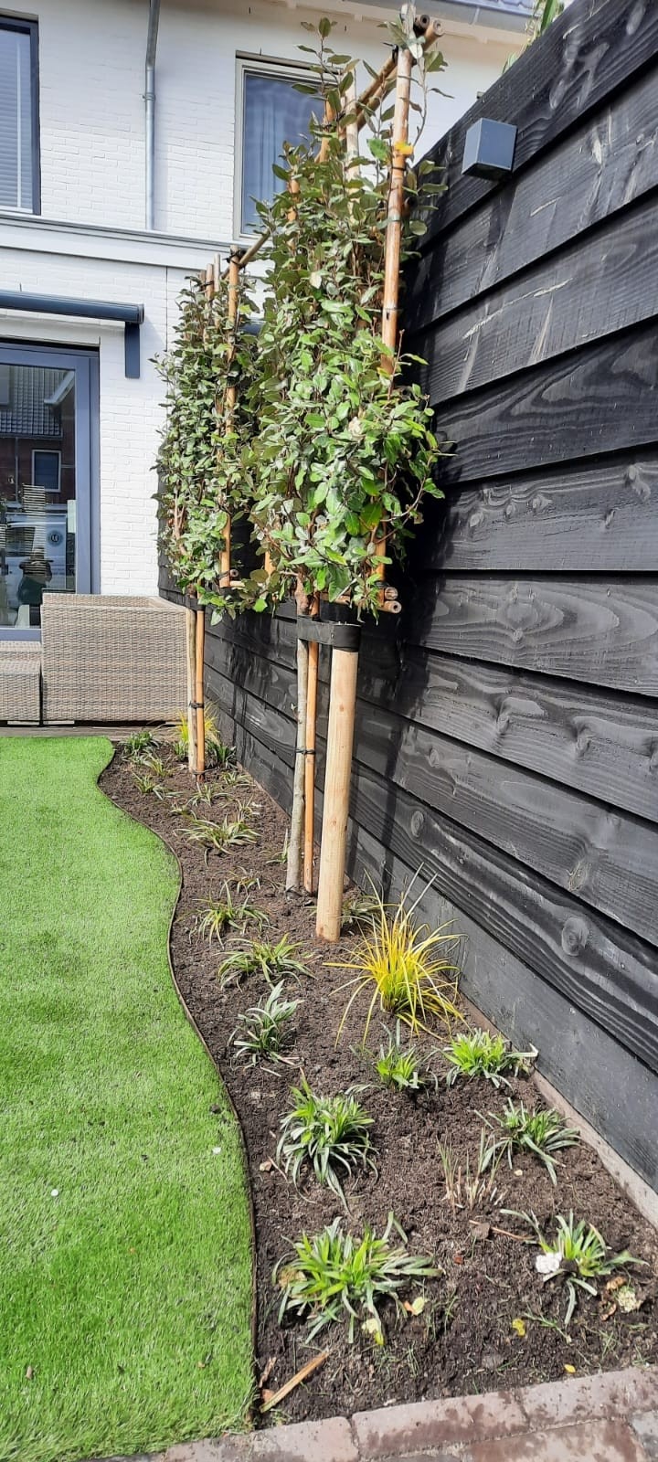 Het bestaande gazon hebben wij verwijderd en aangepast naar kunstgras. De borders zijn afgezet met cortenstalen randafwerking. Diverse grassen en twee lijbomen maken het geheel af.