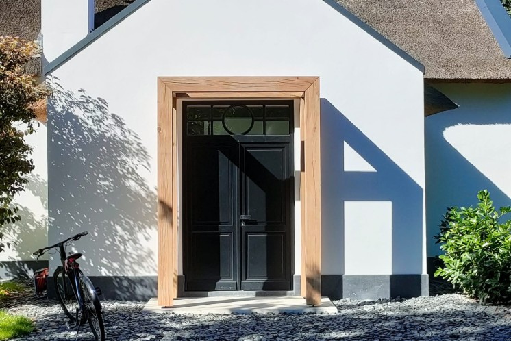 In Blaricum hebben wij een maatwerk constructie van gedroogd eiken gemonteerd als Pergola om de entree meer body te geven.