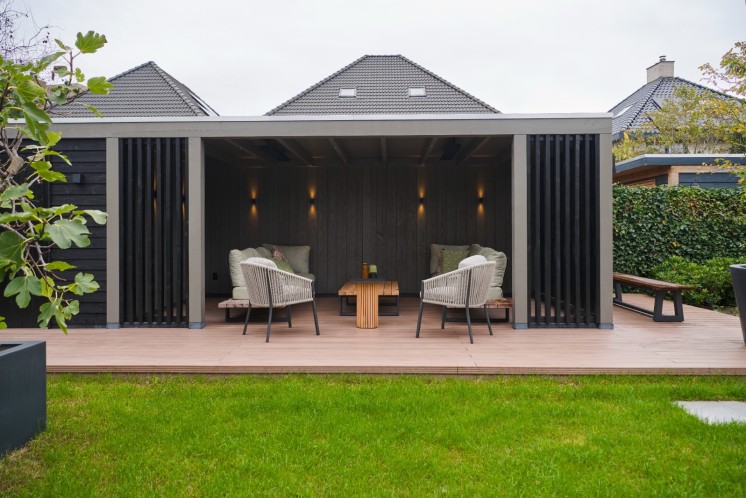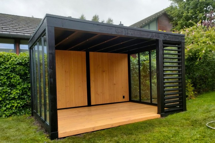 Lees verder Een kapschuur of zadeldak? Fraaie samenstelling door een witte constructie met zwarte wanden.